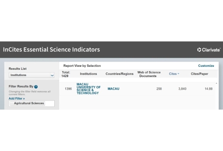 澳科大目前有十一個學科領域被引用次數達致國際排名前 1%而躋身美國頂尖學術基本科學指標 (ESI),包括: