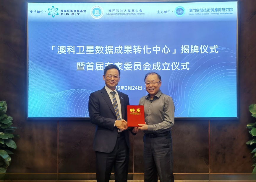 2024年12月19日上午,習近平主席視察澳門科技大學的「澳科衛星科學與應用數據中心」,聽取了「澳科一號」衛星首席科學家匯報衛星成果、「澳科二號」衛星計劃及組建中國首個高精度地磁衛星星座的方案。主席充分肯定項目成果,並指示盡快搭建地磁應用系統平台,服務國民經濟各行各業。為響應習主席視察的重要指示,在澳門科學技術發展基金的支持下,「澳科衛星數據成果轉化中心」於2026年2月24日在珠海舉行揭牌儀式暨首屆專家委員會成立儀式,由澳門科學技術發展基金行政委員會主席余雨生、澳門科技大學校董會副主席兼秘書長陳季敏、澳門科技大學校長朱健康、專家委員會主任廣州大學教授樊軍輝揭牌,還有來自澳門科學技術發展基金、澳門科技大學基金會、澳門科技大學及多所內地高校的專家學者齊聚一堂,共同見證這一重要時刻。