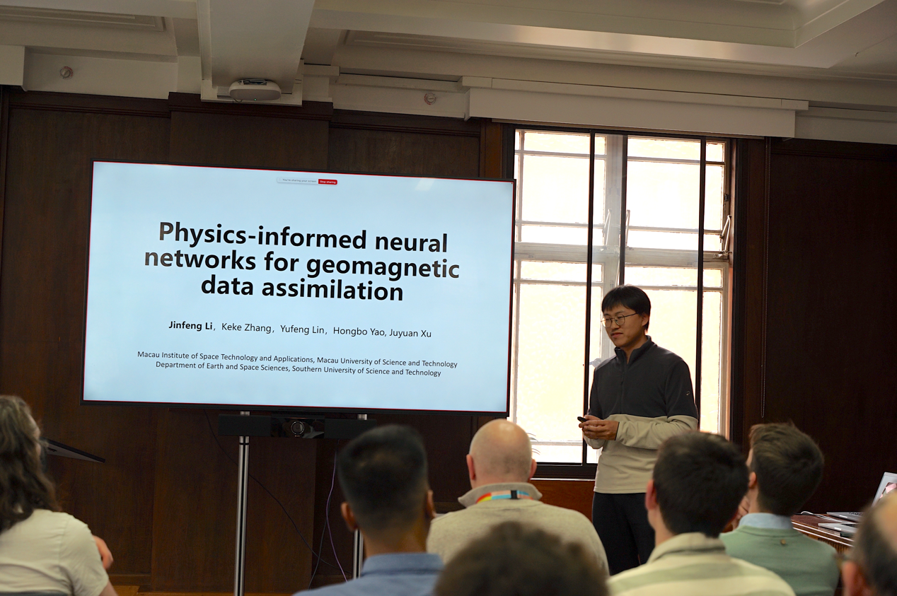 倫敦自然歷史博物館舉行的首場國際專題研討會是繼2025年5月澳門「首屆Swarm衛星與澳科一號衛星聯合科學會議」後的學術研討會議延續。與會專家圍繞衛星地磁數據與應用、地磁模型構建及地球發電機動力學等科學問題開展深入討論。會上,英國愛丁堡大學、世界著名地磁研究權威專家Kathy Whaler教授在會議上詳細報告了利用「澳科一號」等數據研究地球液核快速波動的新成果,高度肯定了「澳科一號」衛星數據的高精度與不可替代性;「澳科一號」衛星科學團隊成員李力剛、馮彥、李金峰及張佳璇分別在研討會上做報告。李力剛詳細報告了「澳科一號」衛星數據校正的分析技術;馮彥報告了「澳科一號」衛星地磁數據在研究岩石圈磁場建模的新研究成果;李金峰報告了將物理約束融入機器學習以優化地磁數據同化在地球發電機的前沿研究;張佳璇詳細報告了「澳科一號」衛星地磁數據的最新進展;多國科學家就利用「澳科一號」衛星數據開展的多項研究報告了科學成果。