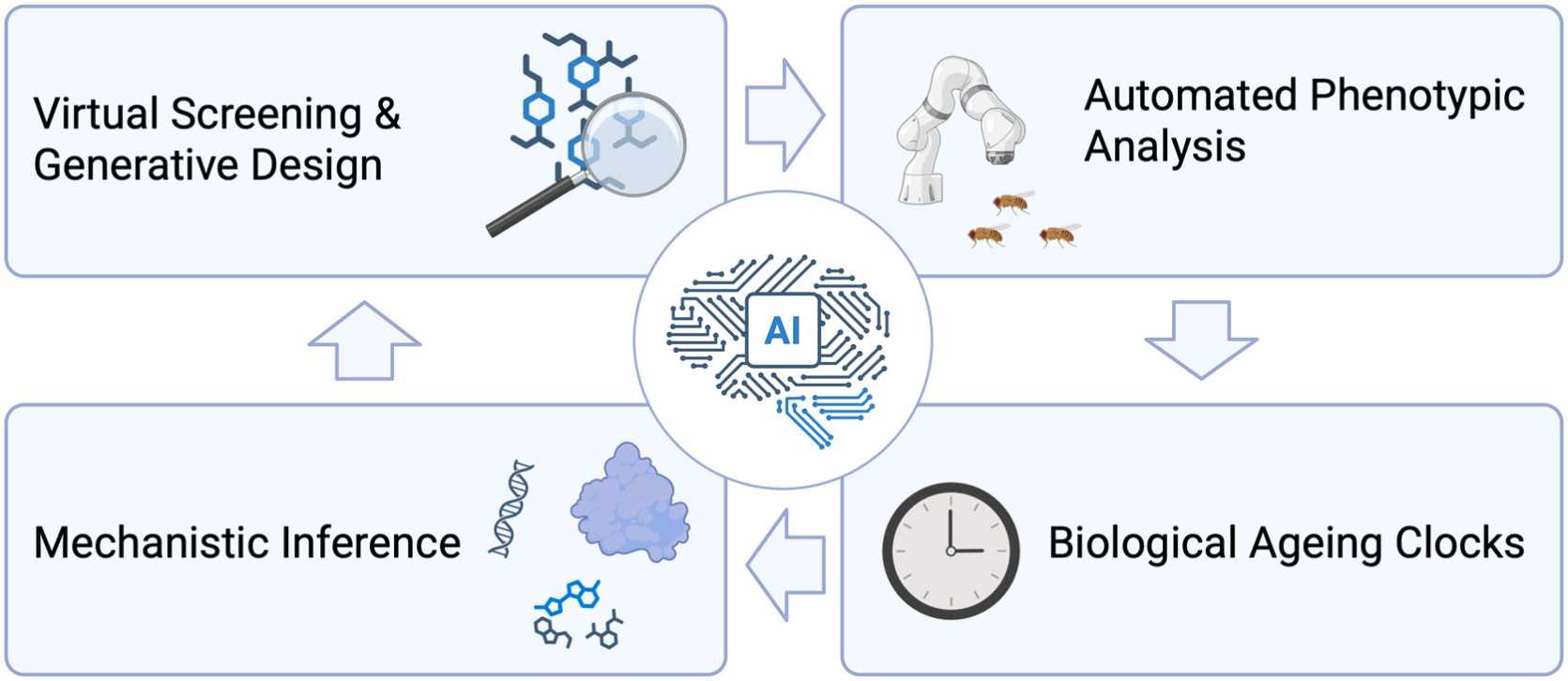 圖3:透過以下技術強化了衰老研究與藥物開發中高通量篩選(HTS)的各個階段:虛擬與生成式化合物設計,自動化表型篩選,生物學衰老時鐘,機制分析