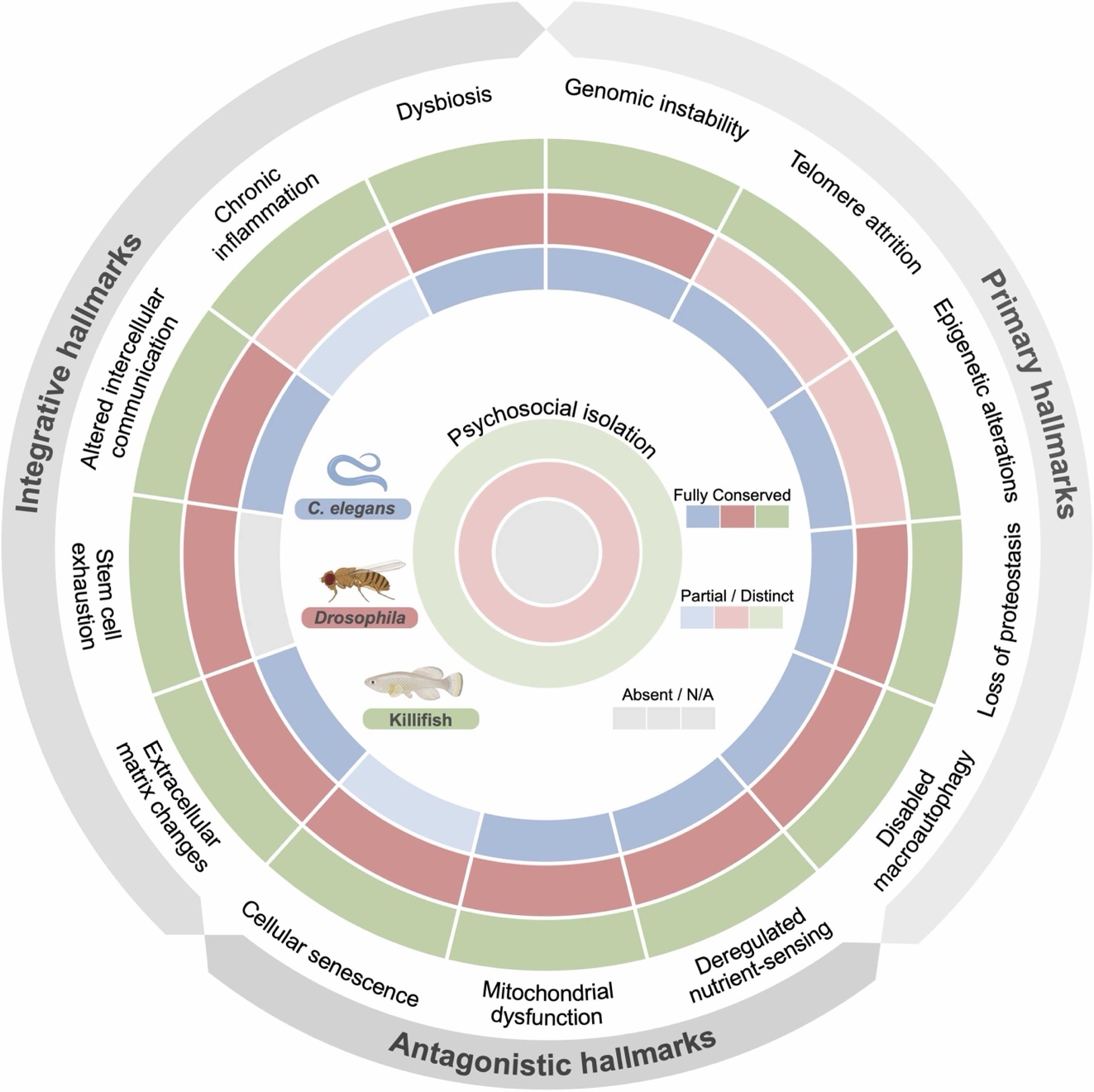 圖二:三種模型生物線蟲、果蠅以及非洲鱂魚,能夠重現絕大多數的衰老標誌物,為研究與人類衰老相關的保守通路以及發現抗衰藥物提供了極大的便利