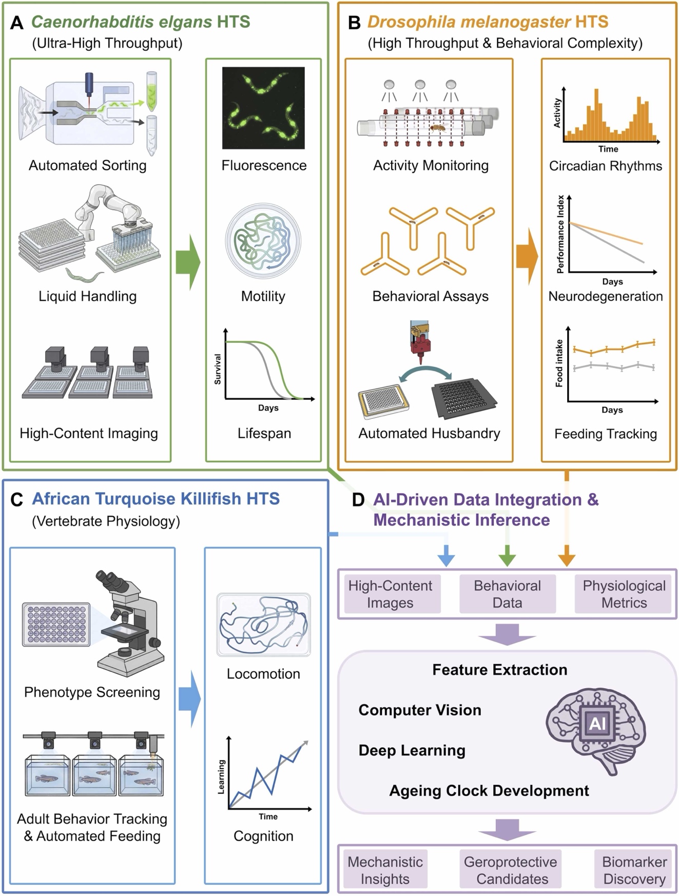 在抗衰藥物研發管線中,傳統的細胞系模型難以模擬複雜的個體衰老,而斑馬魚、小鼠等脊椎動物模型雖具代表性,但其長達數年的壽命使得研發週期與成本極高。本綜述聚焦於與人類衰老機制高度保守的短壽命模型:線蟲與果蠅,並重點探討了非洲鱂魚這一脊椎動物「新星」在橋接轉化醫學中的關鍵作用,提出了一套整合多組學、自動化監控與 AI 視覺推理的「抗衰藥物發現新範式」。